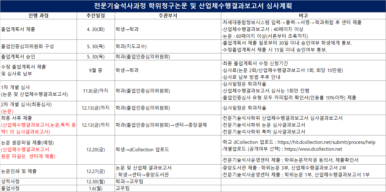 | [전문기술석사과정] 전문기술석사과정 학위청구논문 및 산업체수행결과보고서 심사 계획 안내 | ||